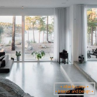 Zones flow from one to another, forming a single whole. This is due to the color scheme based on white with the addition of various bright colors. For example, yellow cabinets in the kitchen and in the office area, a lemon carpet in the interior of the living room and striped cheerful wallpapers are supplemented by small elements - the same bright lamps, pillows.