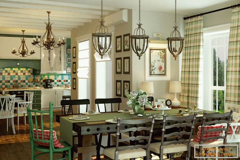 The wooden material present in stylish kitchen and other rooms in the form of a coating on the floor and walls, allows you to relax and calm down. The windows of large sizes perfectly illuminate the rooms, which in itself positively affects the person. The blue and white varnished finish harmoniously combines with the inserts made of wood and dynamically completes the color effect. The ceiling itself is very individual in every part of the apartment, interestingly complementing the entire interior. And small details in the form of curtains and chandeliers are matched in tact with all the idea and do not violate the intriguing balance. The interior and harmonious interior of the premises generously reveals all its positive features.