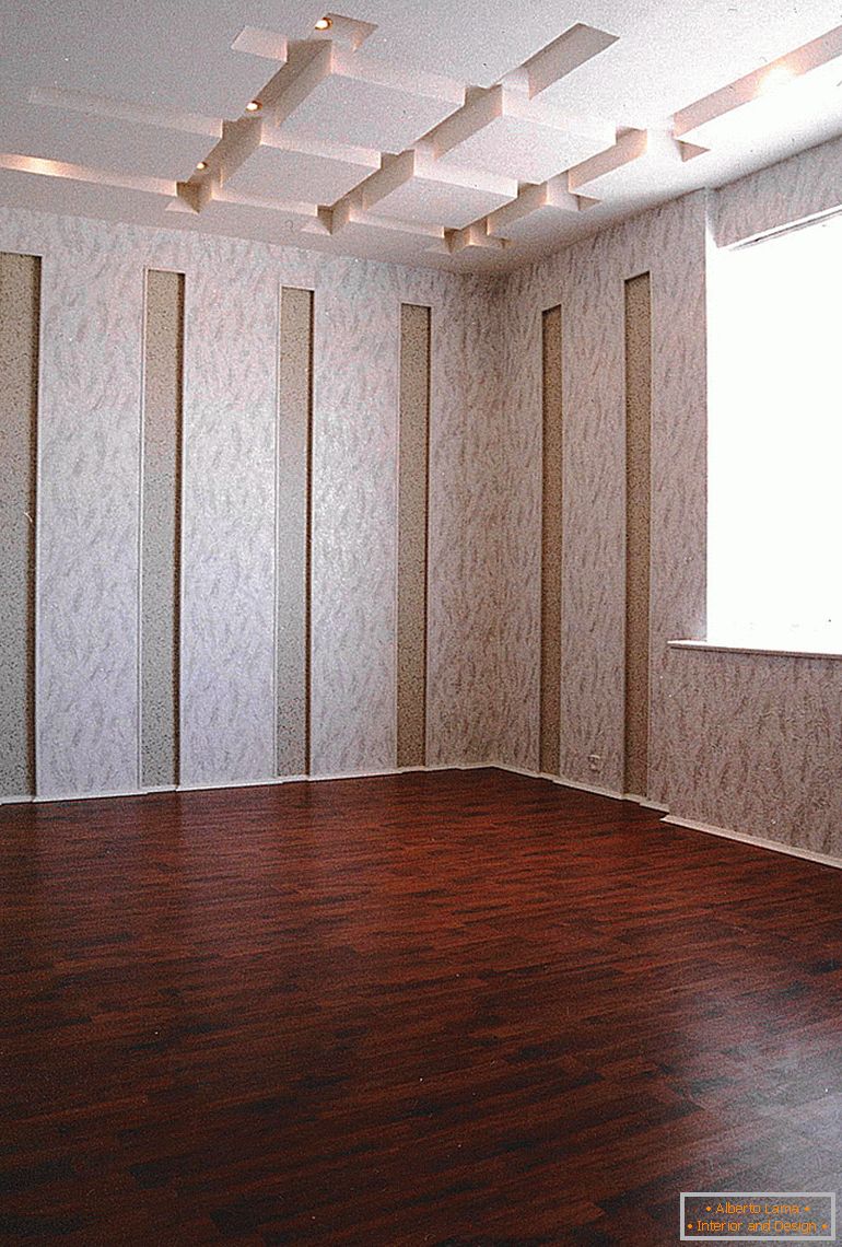 In the reconstructed apartment remained the same ceiling with exposed beams. The interior was only supplemented by an original chandelier with five different size plafonds, LED spot lights with a cylindrical shape and a light floor lamp in the style of minimalism.