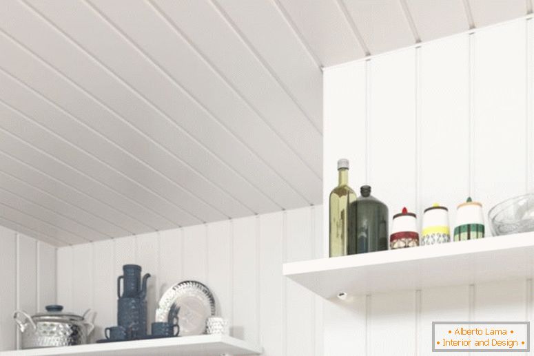 Stylish, but compact cottage is decorated in a light and attractive farmer style, so the working area repeats its manner. Snow-white facades, a headset and a bright floor with glossy reflections, attractive table tops and interesting details in the design merge in the picture with an ideal balance. The idea of an interior for a small room is that homeowners placed here a minimum of home appliances, leaving enough room for convenient cooking.