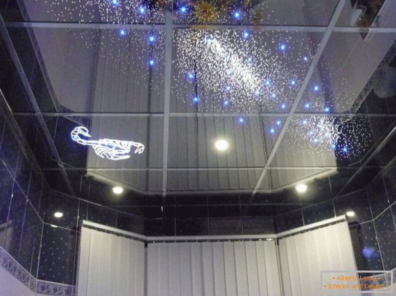 The ceilings in our apartments are low and far from the right proportions. Chandeliers that are used in these interiors are not suitable for low ceilings. Professionals working on this project found the right solution and made a stained glass window in the ceiling with a bright backlight.