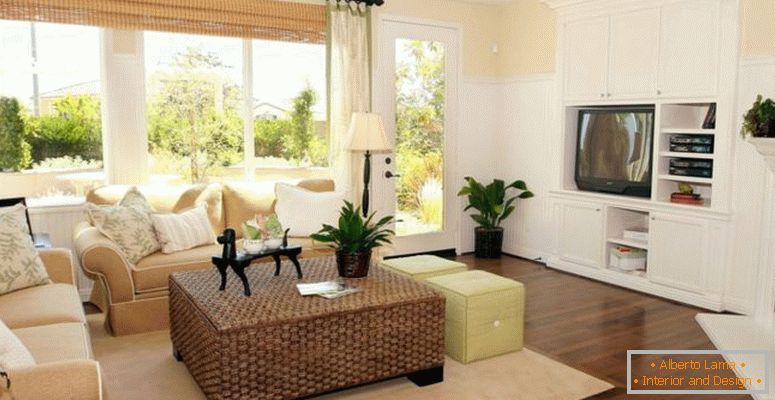 Another very nice option, in which the kitchen-living room is located at the bottom, the bedroom - at the top, and the huge windows are the ideal solution for a small space. White walls, giving more light, fit any interior, but they look particularly elegant here, in a room with a small footage.